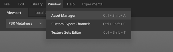 The Asset Manager is a single place to manage all your assets in your project. It is accessible through the ‘window’ option in the top bar.