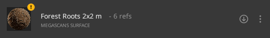 One of the most important uses for the Asset Manager is to highlight any missing assets in a saved mix. Once a saved mix is loaded again, the Asset Manager will highlight any Megascans component or asset missing from the mix with an exclamation mark. While the Asset Manager will indicate missing assets with an exclamation mark, the exclamation marks will point towards the layer stack’s specific component.