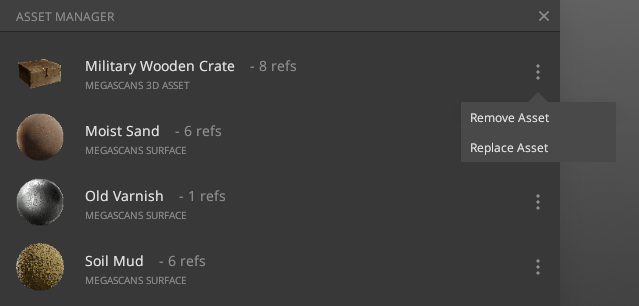 For a Megascan asset, the “replace asset” option will take you to the library to pick another asset. This option changes the asset’s source; however, the channels’ settings continue to remain the same as before you replaced the asset. This allows for quickly trying different assets with the older settings and see the changes in the mix.