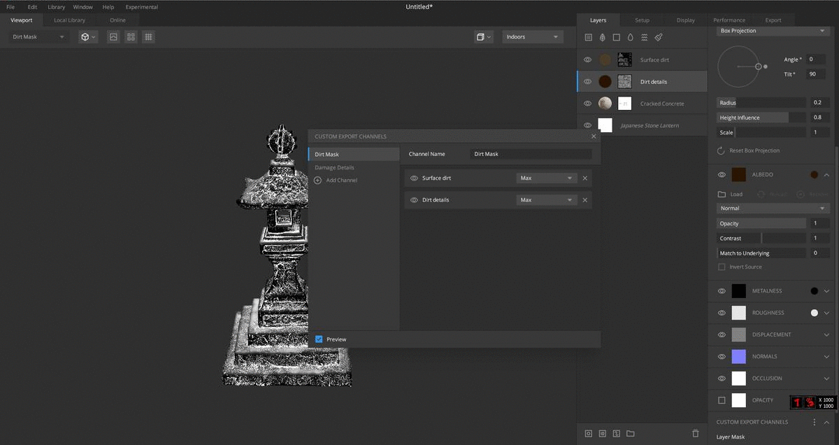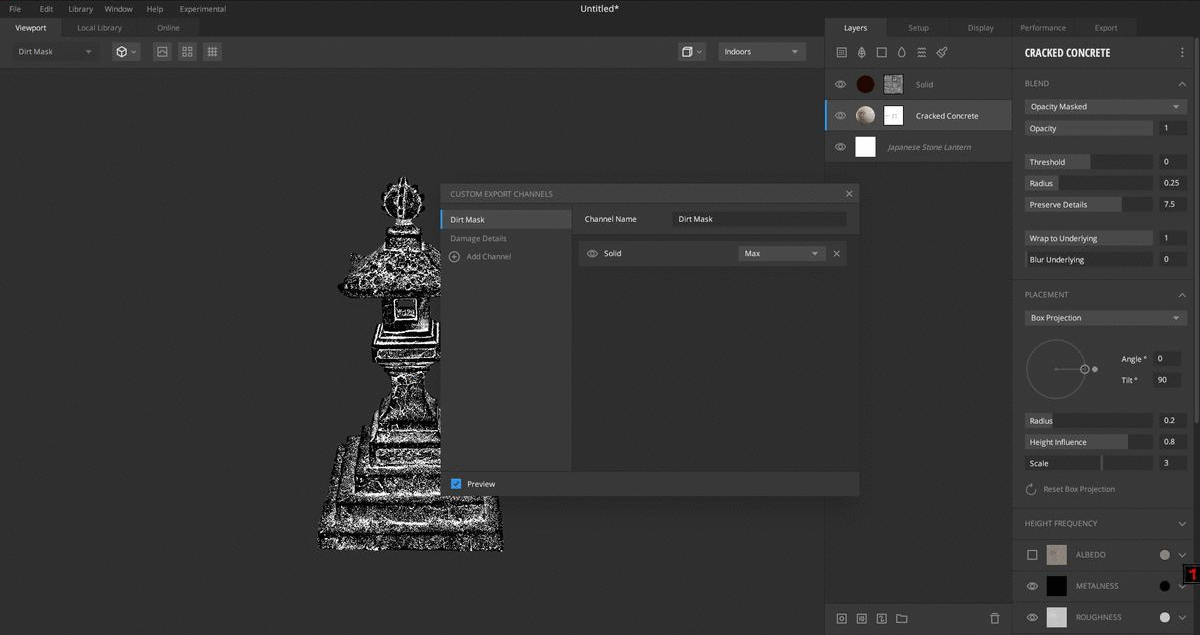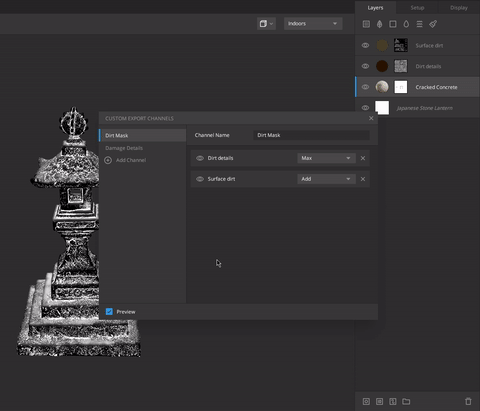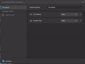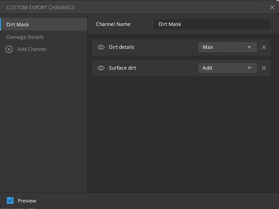 The preview is on by default and renders the selected channel’s mask information. This allows to quickly preview the expected output of the channel when exported to disk.