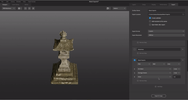 Once the custom channel has the required masks’ information, it can be exported via the Export tab. The export panel is designed to help you organize the masks’ information by optimizing file sizes, reducing memory usage, and saving multiple masks through Channel Packing.