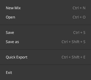 The file menu contains quick actions for creating, saving, loading, and exporting your Mixes.