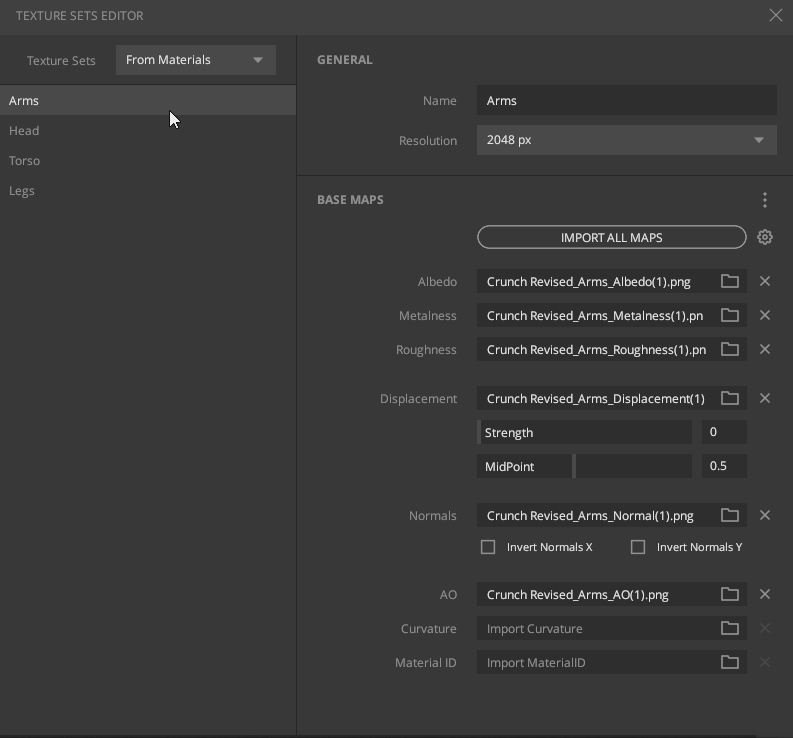 For models with a couple of texture sets, a Load All Maps function has been added to assist in auto-populating base maps for each set instead of spending time to do so manually. To elaborate further, if you have five texture sets, each containing 5 maps, a total of 25 maps will have to be imported manually, which may be tedious and time-consuming. However, by naming your maps with the proper suffix or prefix and configuring the Auto Load Map Names, you can load your maps with a single click.