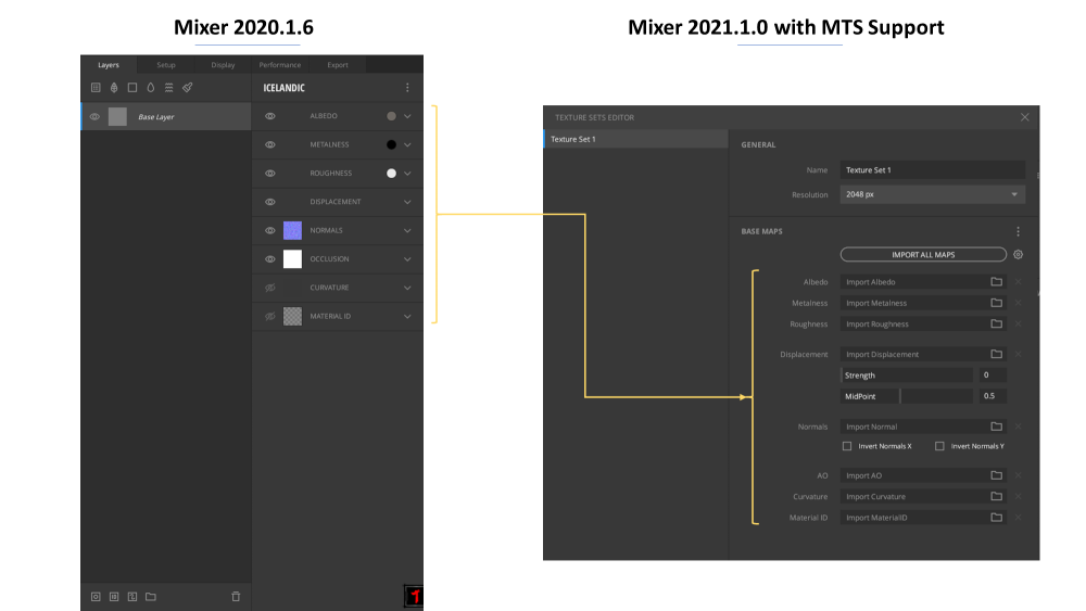 Before the inclusion of Multiple Texture Set support in Mixer, baked maps were added to a Base Layer that existed within the layer stack. The Base Layer has now been replaced by Base Maps that you can add through the Texture Sets Editor.