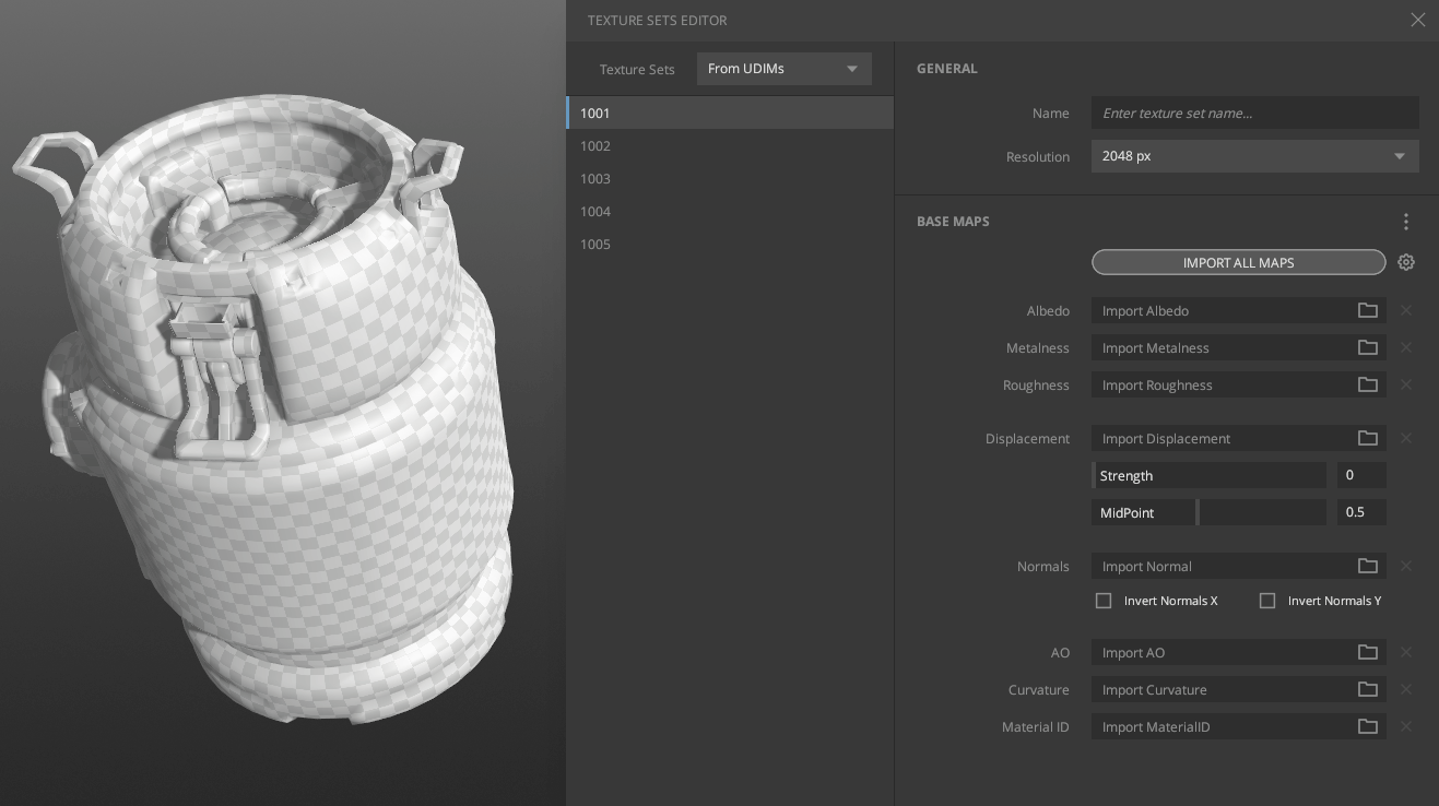 For models with multiple texture sets, Mixer helps you import and set up models based on two workflows, i.e., UDIM or material-based.